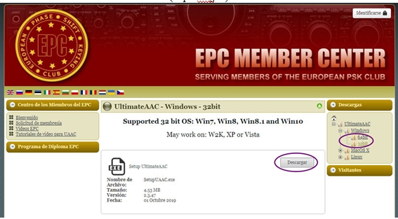 El siguiente paso es ir a la página de EPC (https://epc-mc.eu) y descargar el programa UltimateAAC haciendo clik en Descargas y descargar el programa que mejor se adapte a vuestro sistema. En este caso hemos seleccionado Windows 32 bit.
