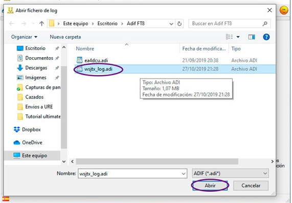 Haremos clik sobre el segundo icono de la izquierda y seleccionaremos la opción ADIF (*adi*), entonces se abrirá una ventana de nuestro ordenador en la que tendremos que buscar el archivo donde tengamos todos nuestros contactos en Modos Digitales. Ojo, siempre con formato Adif.